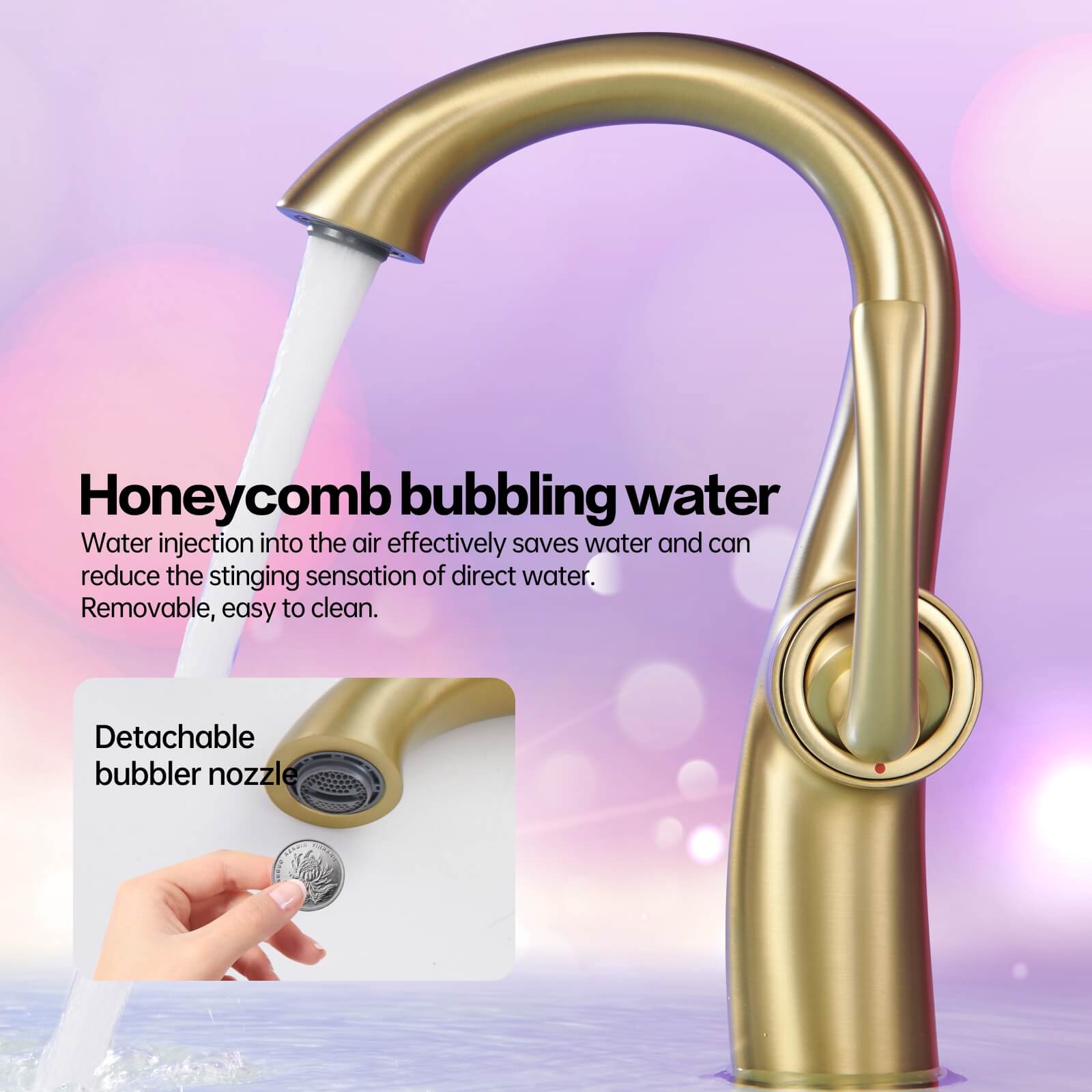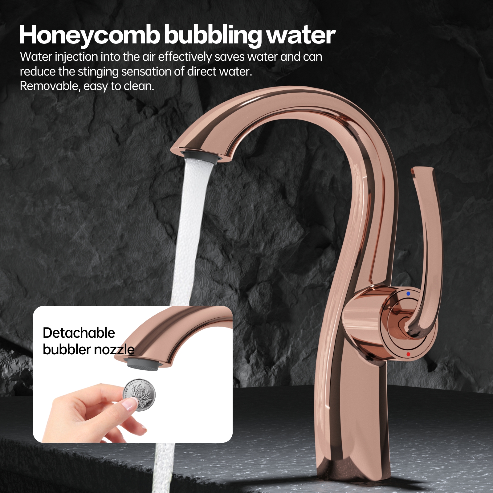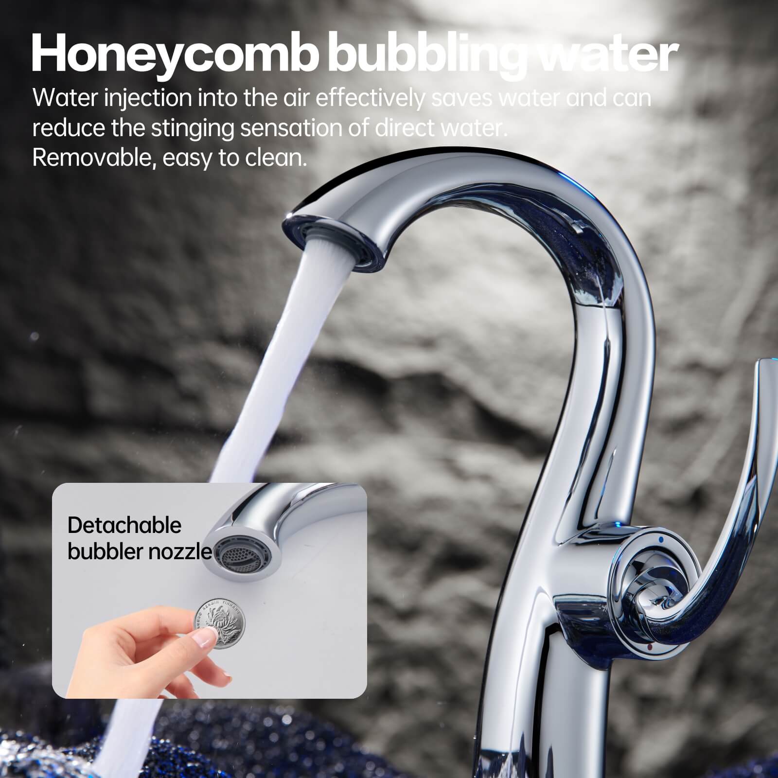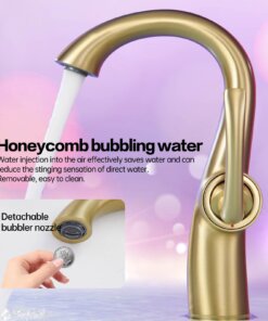 Inspired by the graceful curves of a swan’s neck, this basin faucet seamlessly blends modern and classic aesthetics. Made from high-quality brass, it provides excellent corrosion resistance and durability for long-term use. The dual hot and cold control makes adjusting the water temperature easy and convenient for everyday use. Its honeycomb bubbler not only saves water but also reduces the impact of the water stream on the skin, ensuring a comfortable experience. It is also easy to detach and clean.